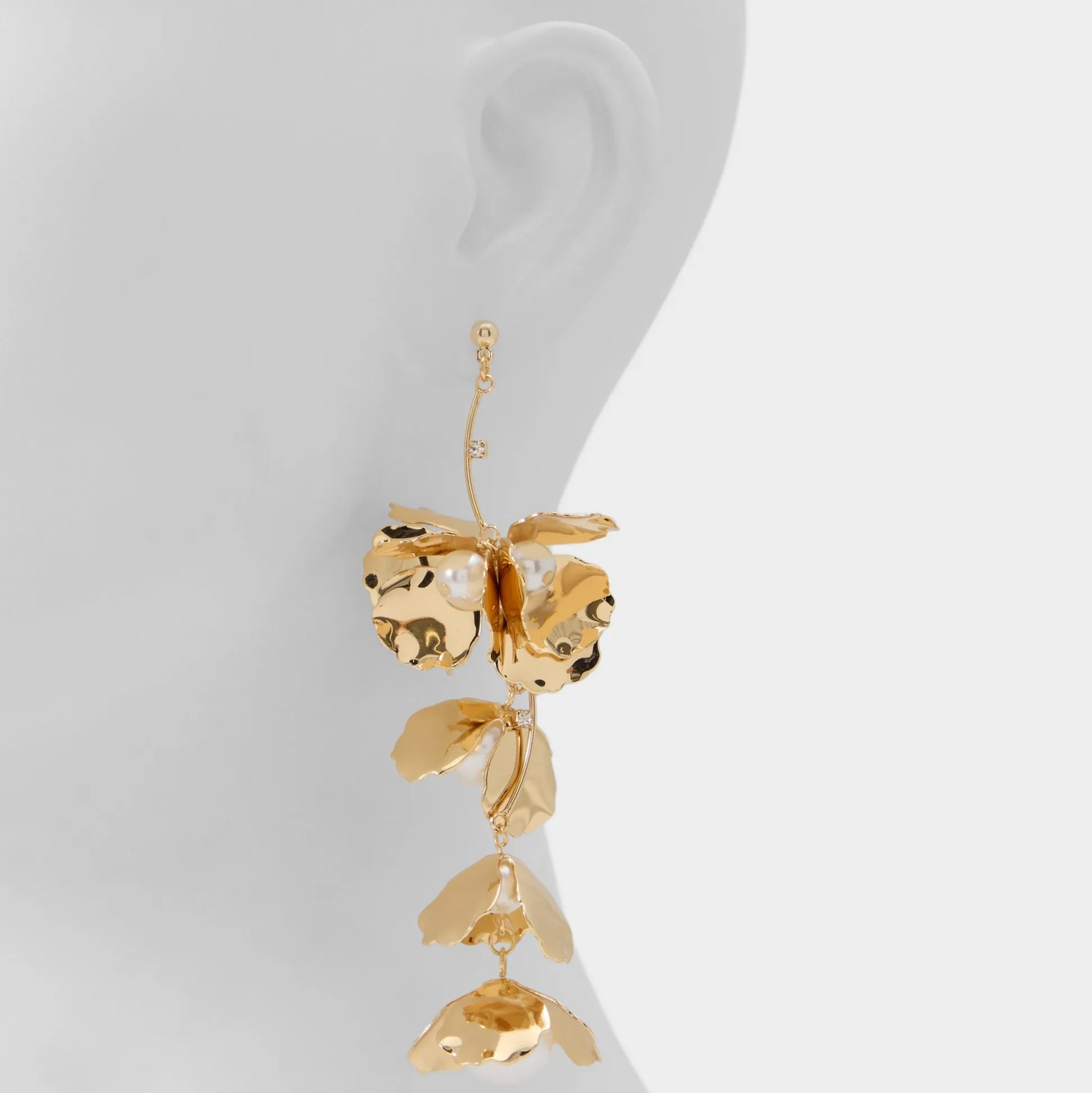 Sculptural earrings feature layered gold petals cradling pearls at their centre, catching light with drama. Top them with blouses at weddings, or pair them with a blazer dress for nights out, and switch to a look with the studs during fittings, photos, and celebrations.