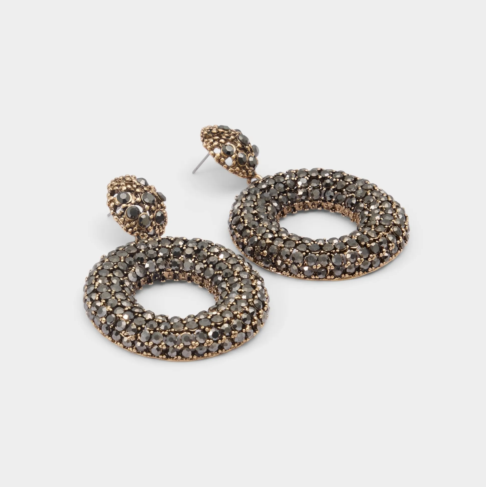 Gunmetal crystals cloak circles that dangle from studs, turning these earrings into glittering halos that shine in low light. Wear with a slip dress at rooftop gatherings, or pair with ear cuffs and a blazer for gallery nights, and let the glow finish every moment.