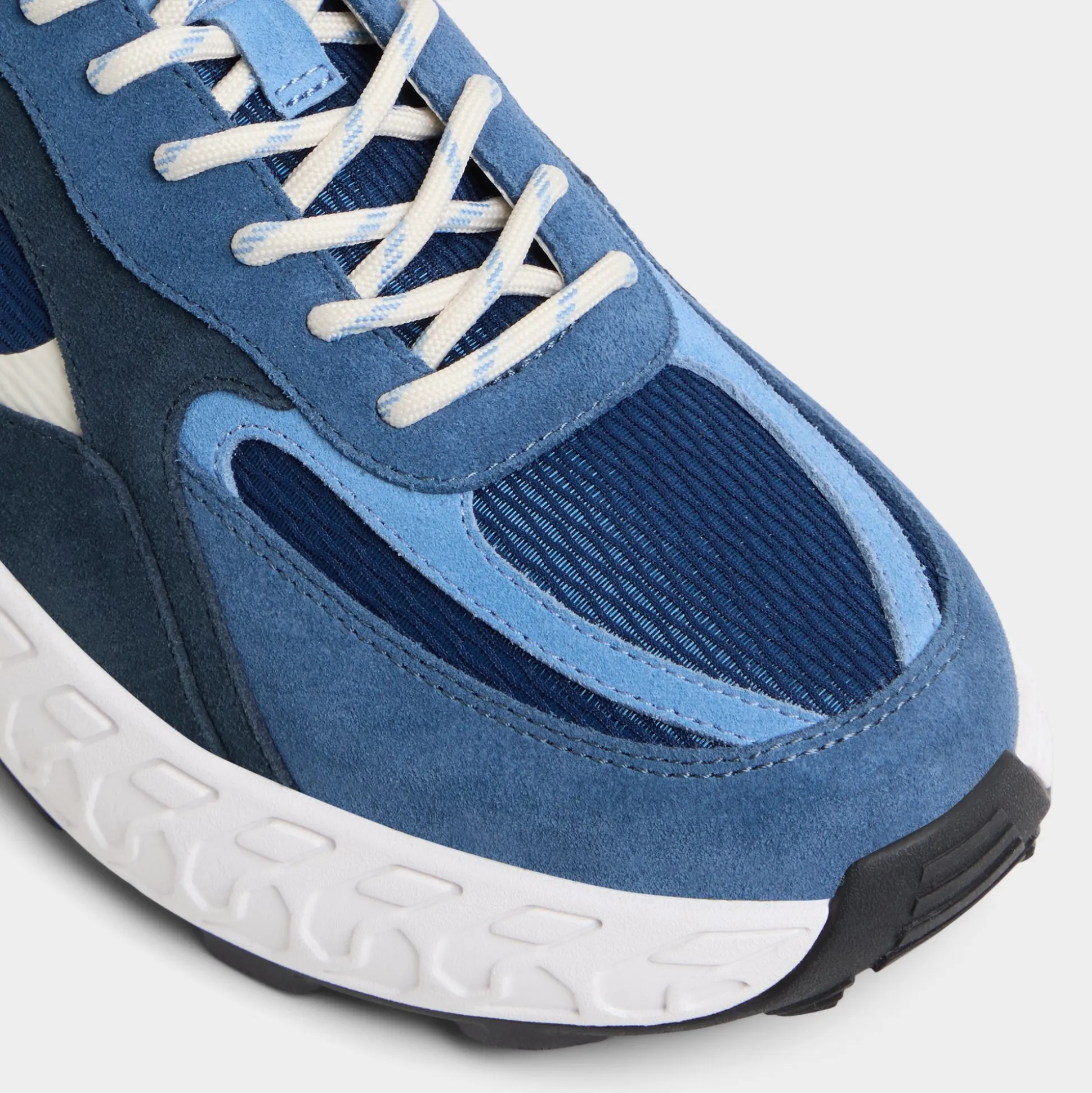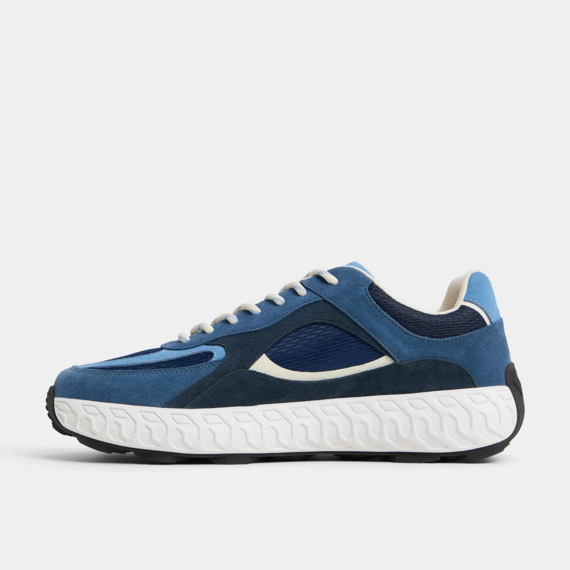 Wave-like sculpting along oversized jogger soles gives this blue suede mesh sneaker a bold silhouette, while airy cushioning keeps everyday steps steady for long days and breezy city strolls. Pair it with tapered denim for coffee runs, or roll with linen shorts for weekend getaways.