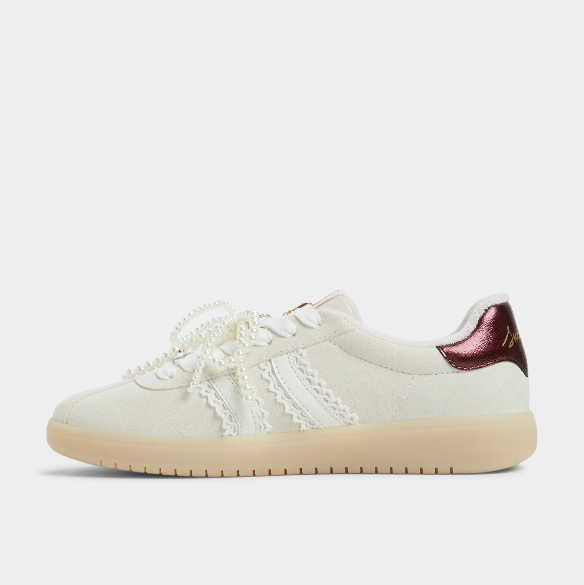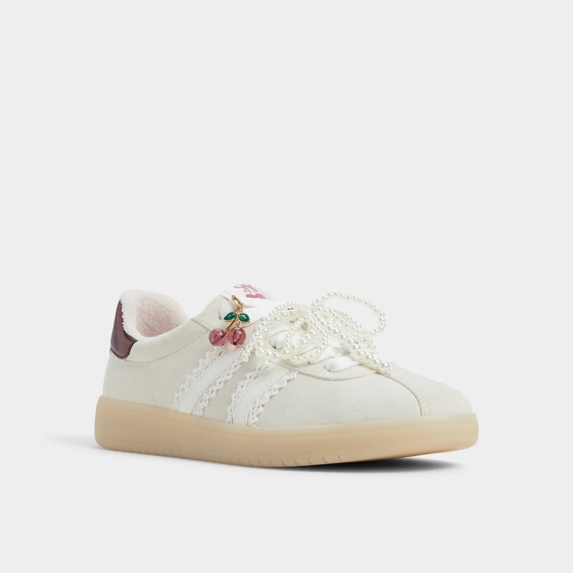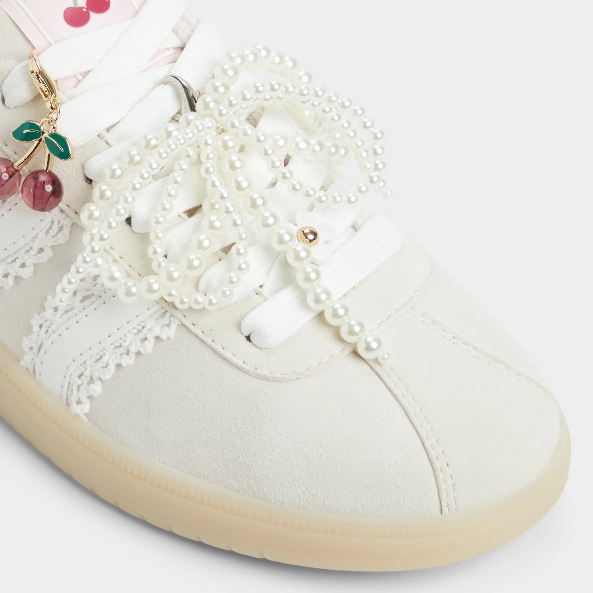 Smooth leather meets breezy canvas on this retro sneaker, but the sparkle is the cluster of pearls and charms that swing from the laces, turning every step into a celebration. Pair with cropped cargos for errands, or swap in under a silky dress when brunch rolls into gallery hopping.