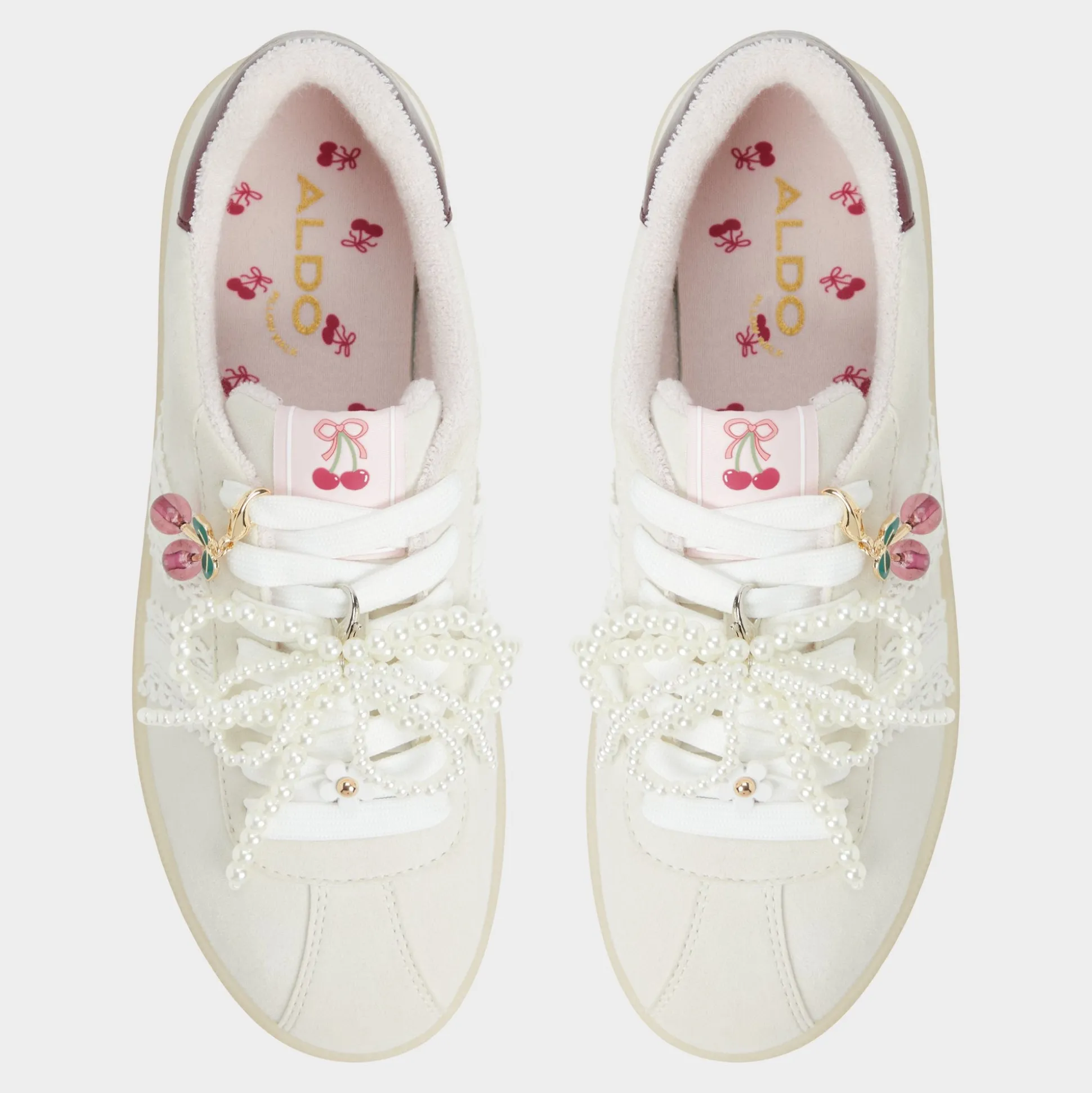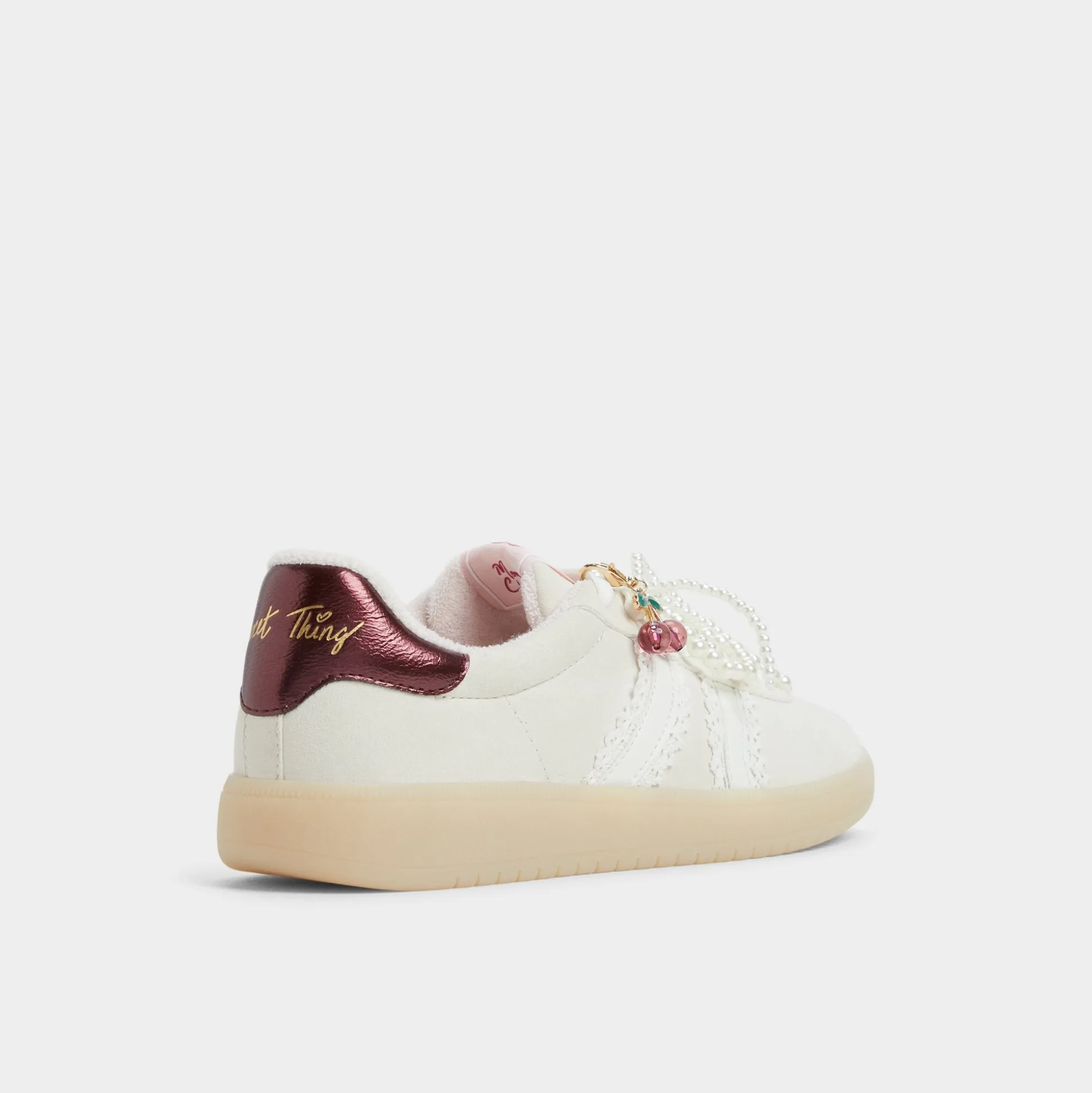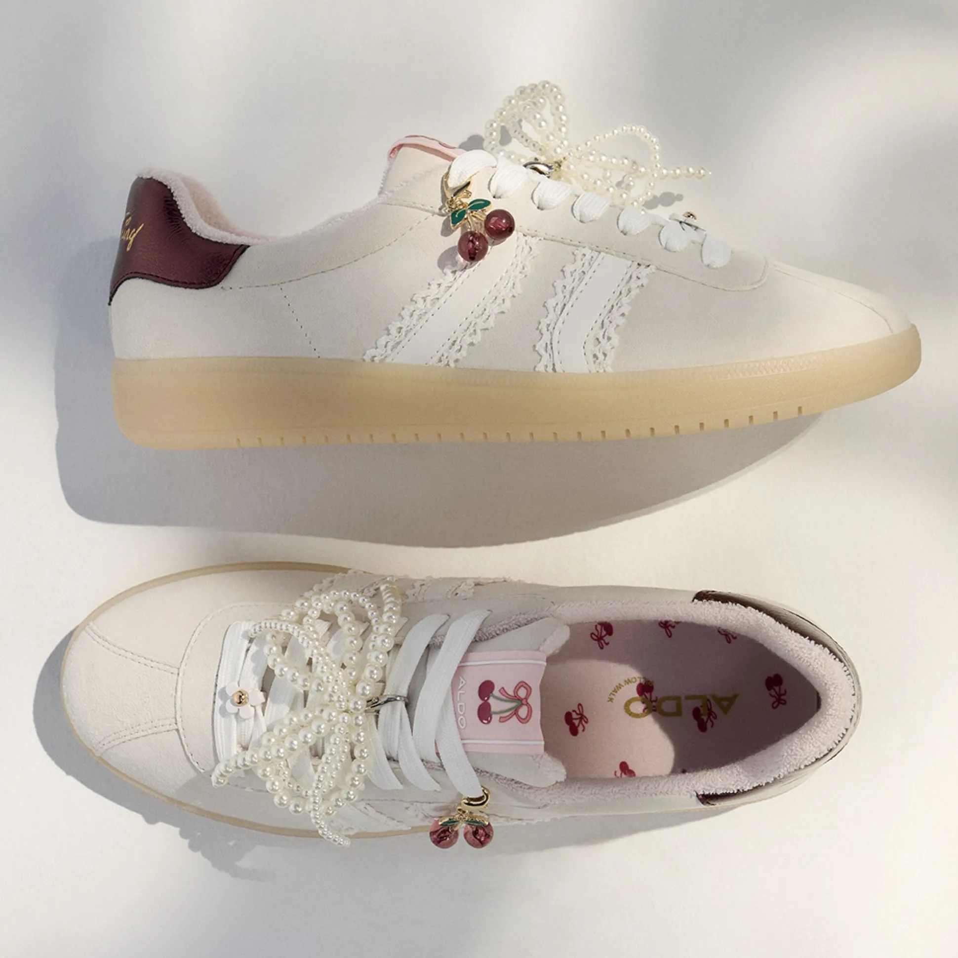 Smooth leather meets breezy canvas on this retro sneaker, but the sparkle is the cluster of pearls and charms that swing from the laces, turning every step into a celebration. Pair with cropped cargos for errands, or swap in under a silky dress when brunch rolls into gallery hopping.