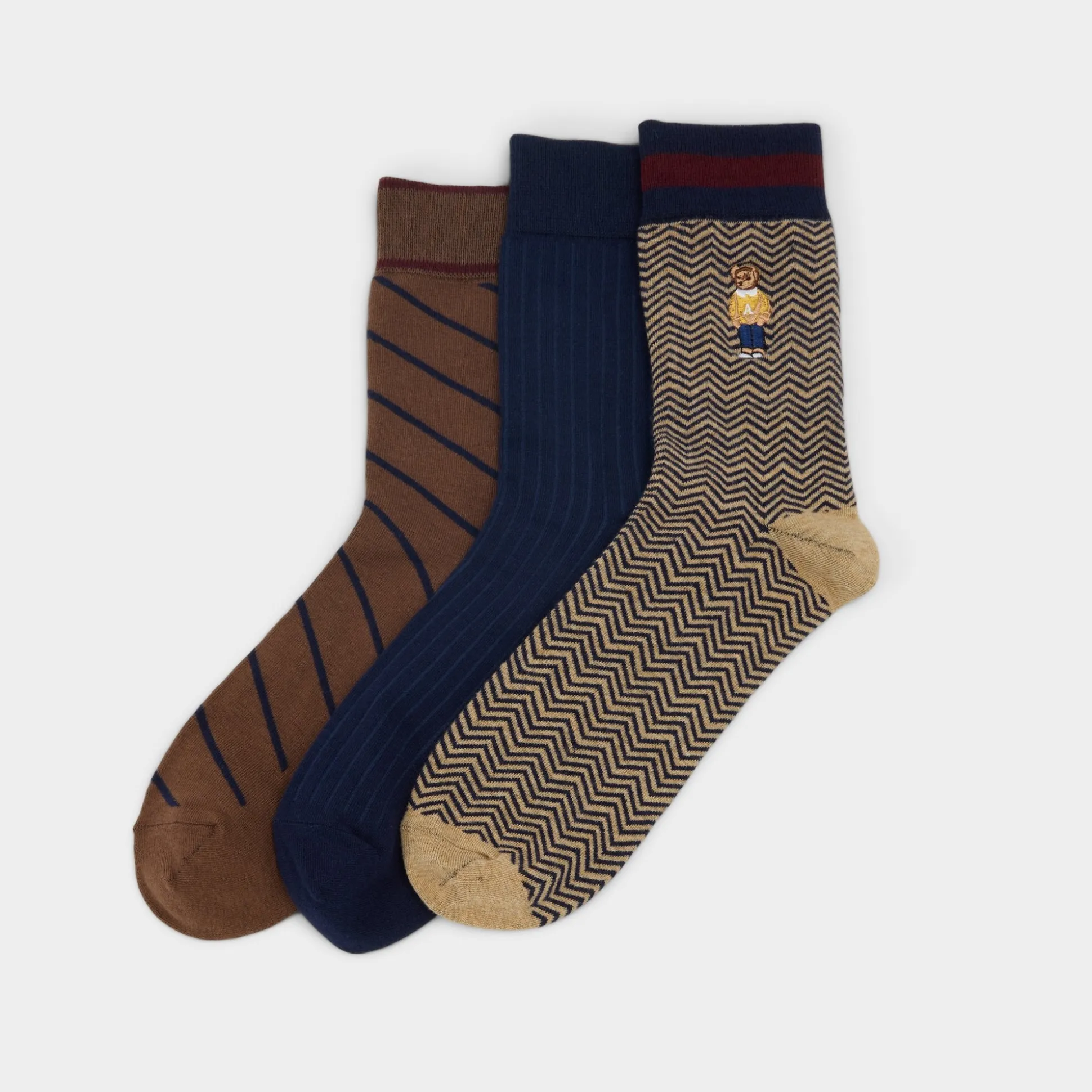 Teddy bear embroidery stands out on chevron socks, paired with ribbed navy and brown stripe pairs for playful charm when legs cross. Flash above loafers on campus runs, or layer them under boots at cafes for two distinct looks that finish outfits with a touch of whimsy.