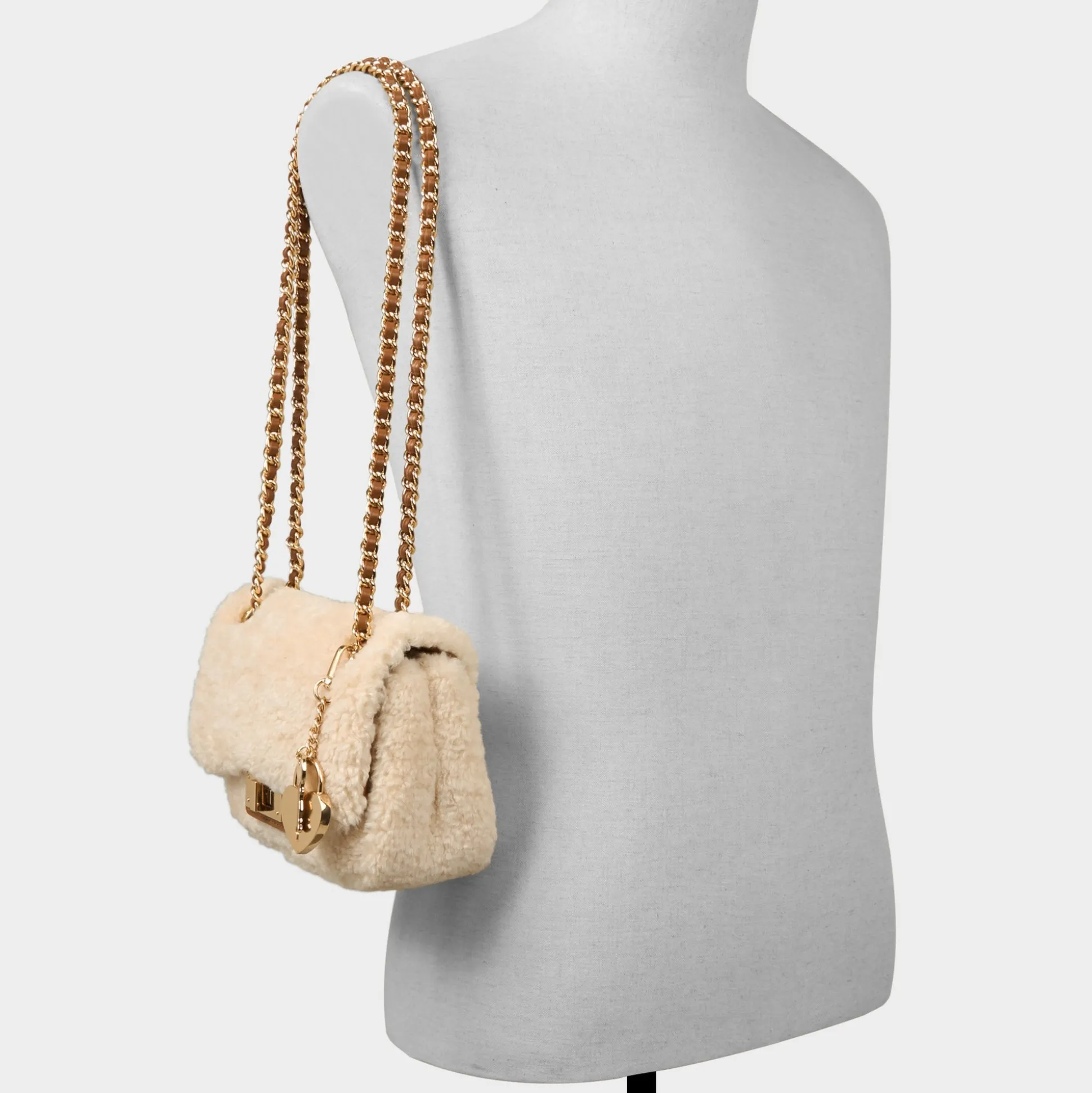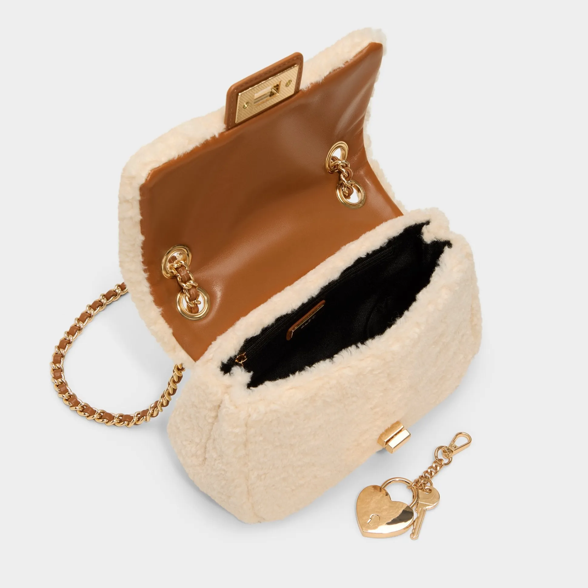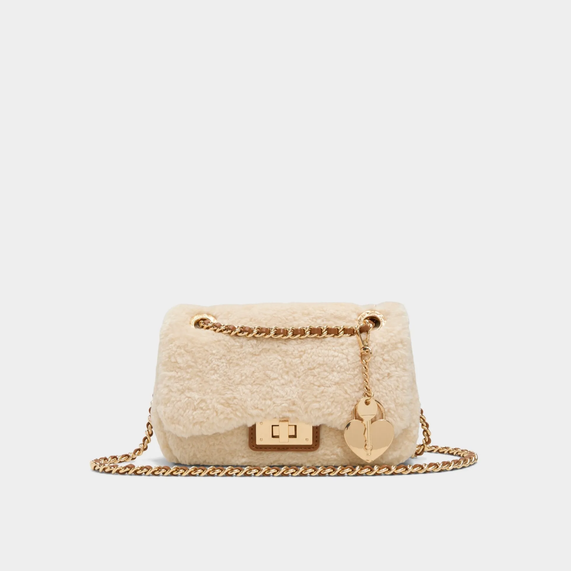 Soft teddy-shearling wraps a mini bag in cozy charm, offset by a gleaming gold-tone chain heart and a tidy turn-lock that flips from day to night with a single click. Carry it cross-body on coffee runs or tuck it under your arm for holiday dinners, finishing looks with a playful edge.