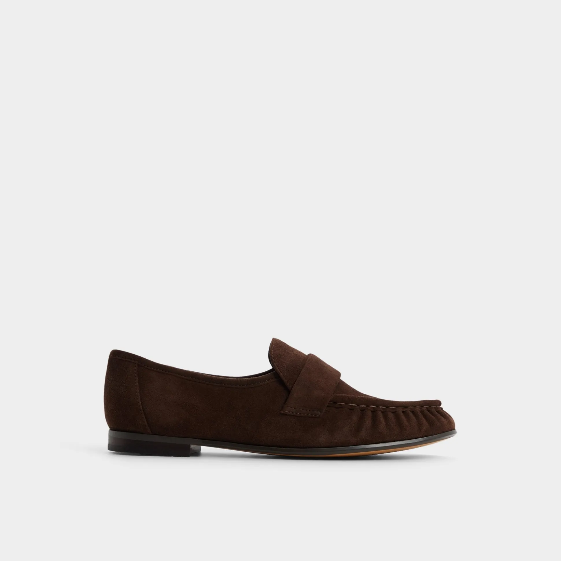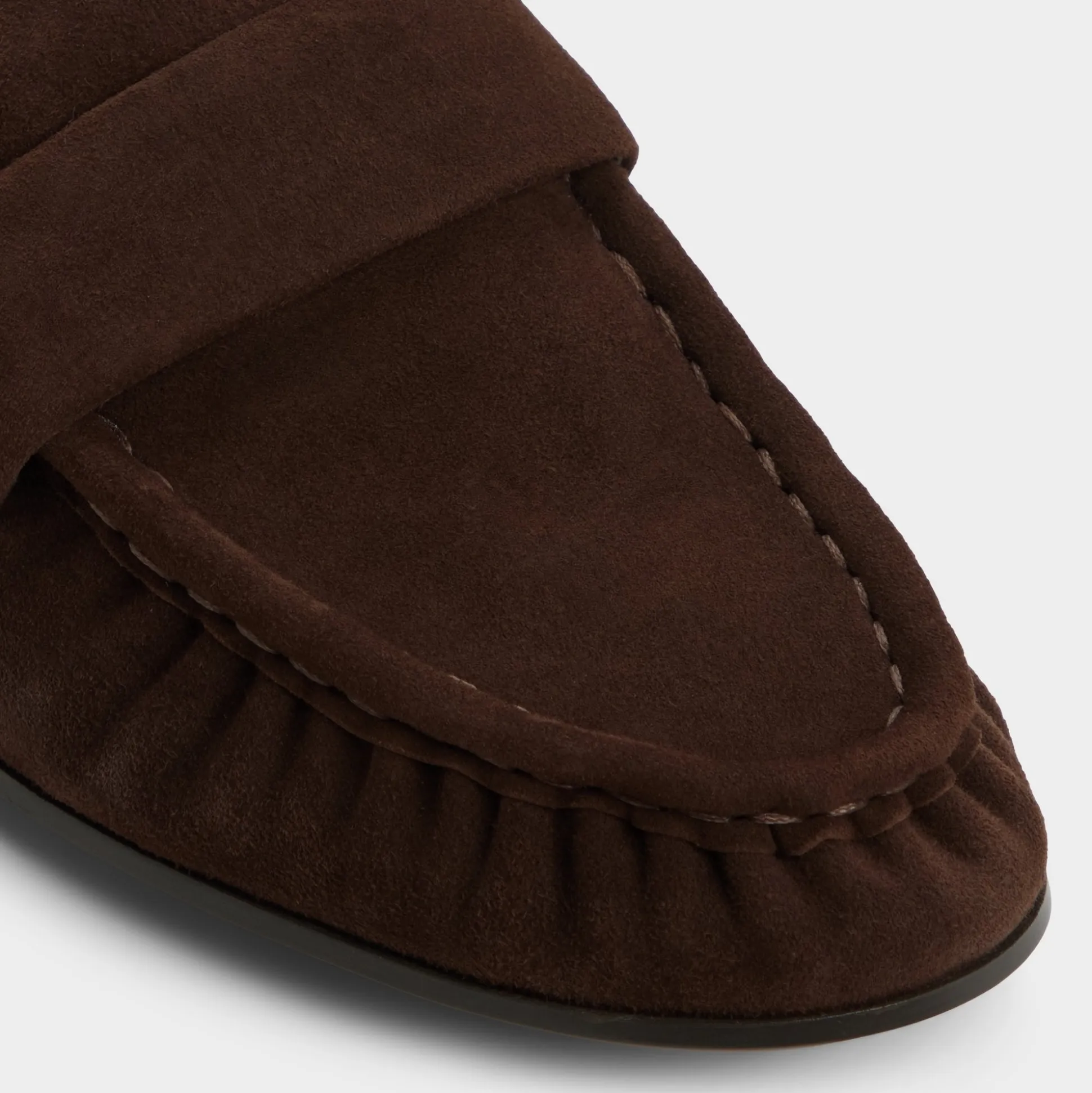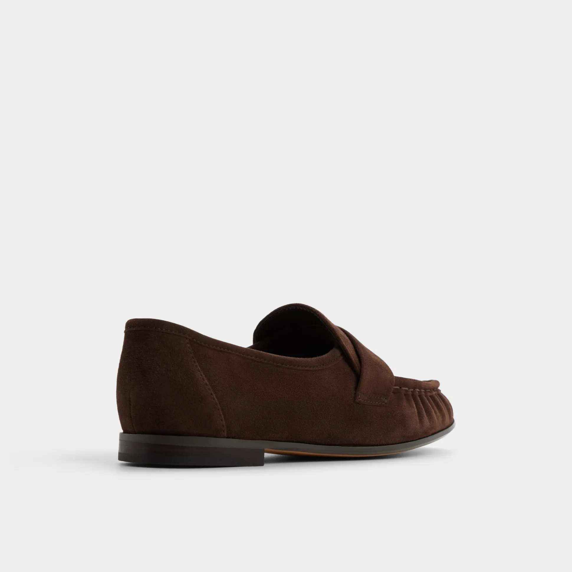 Buttery espresso suede shapes these penny loafers with ruched moc toes and a flexible cupsole, blending tailored refinement with sneaker-like ease and cushioned comfort for long days at every commute and meeting. Ground cropped trousers for presentation mornings, or swap into cuffed jeans when Friday train rides lead straight to patio tapas.