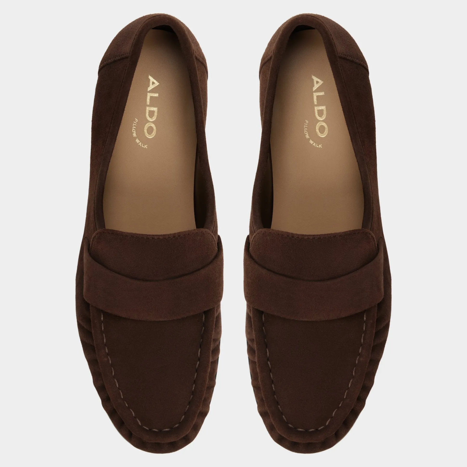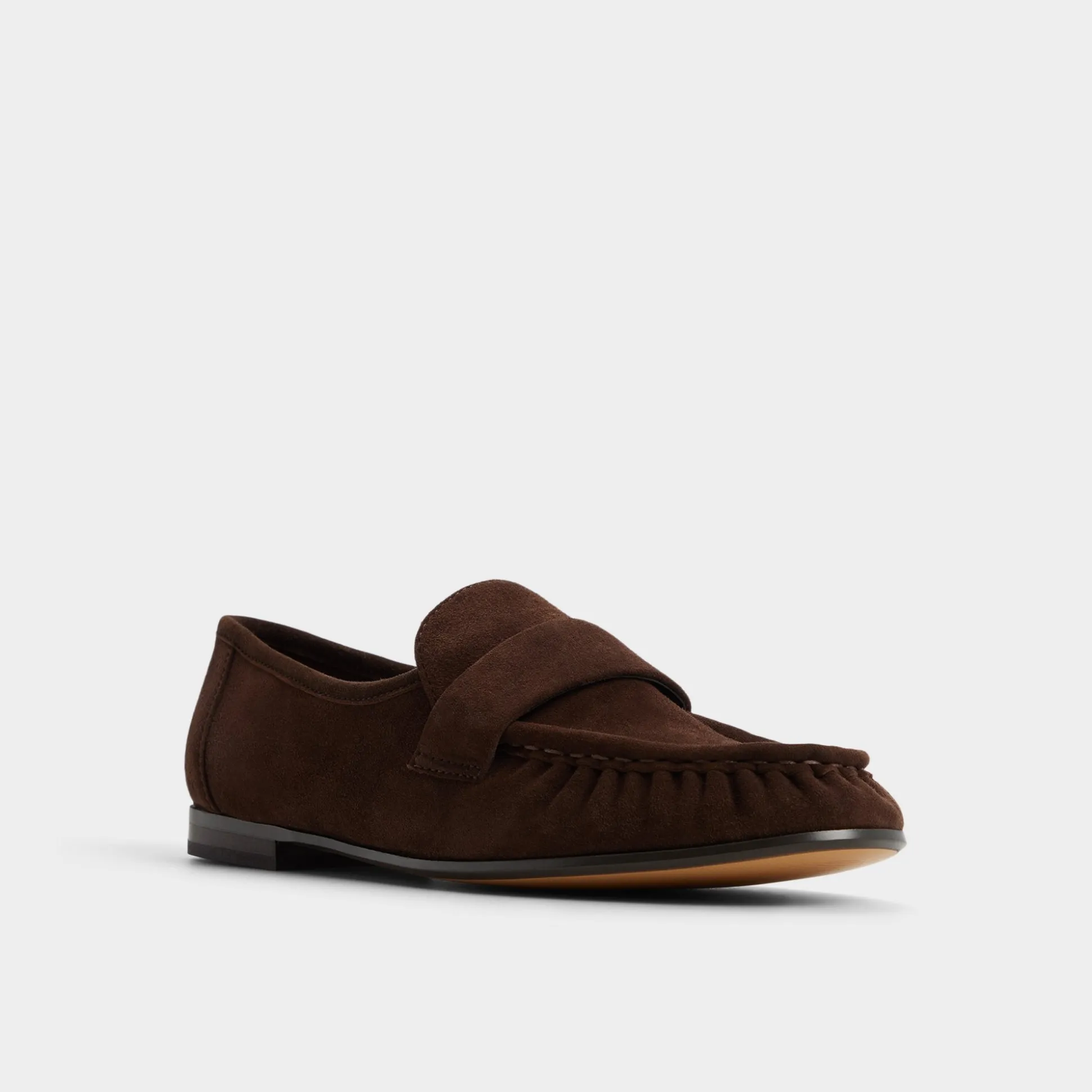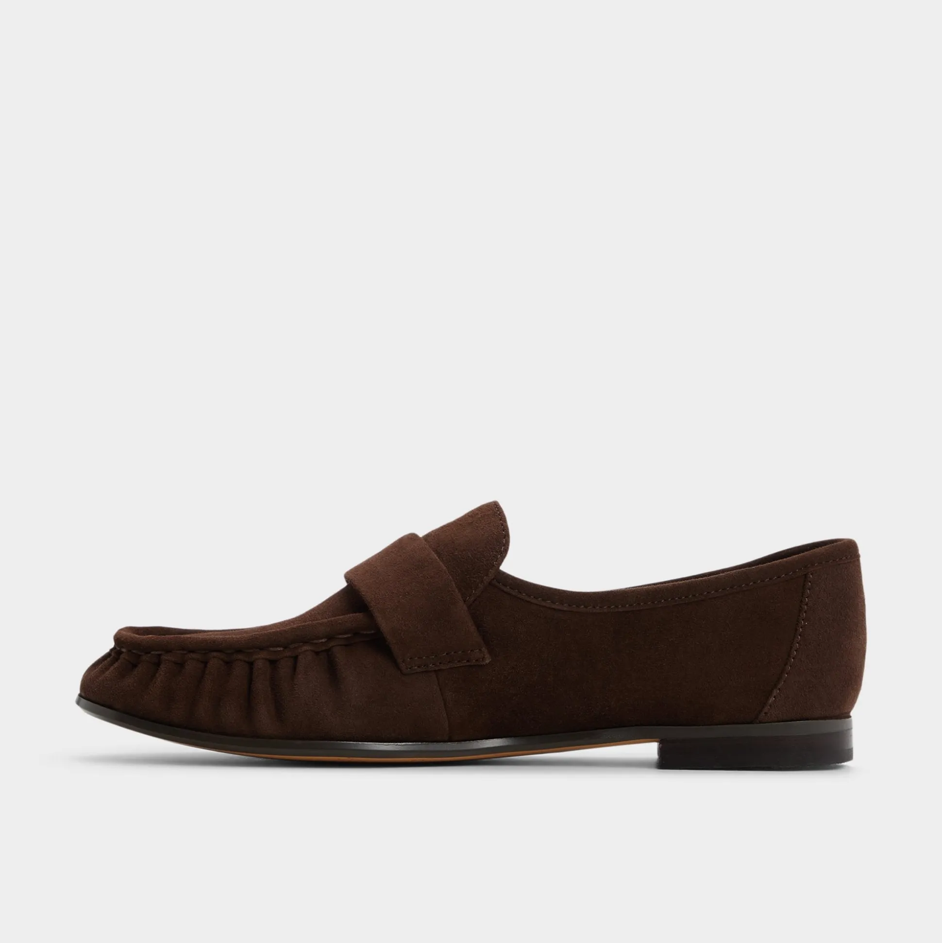 Buttery espresso suede shapes these penny loafers with ruched moc toes and a flexible cupsole, blending tailored refinement with sneaker-like ease and cushioned comfort for long days at every commute and meeting. Ground cropped trousers for presentation mornings, or swap into cuffed jeans when Friday train rides lead straight to patio tapas.