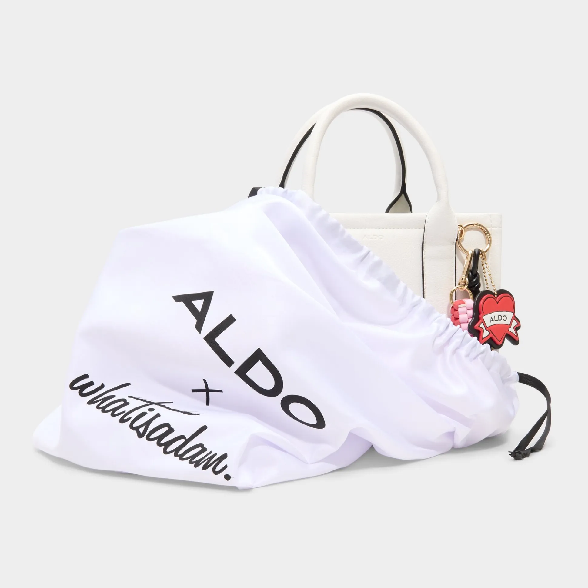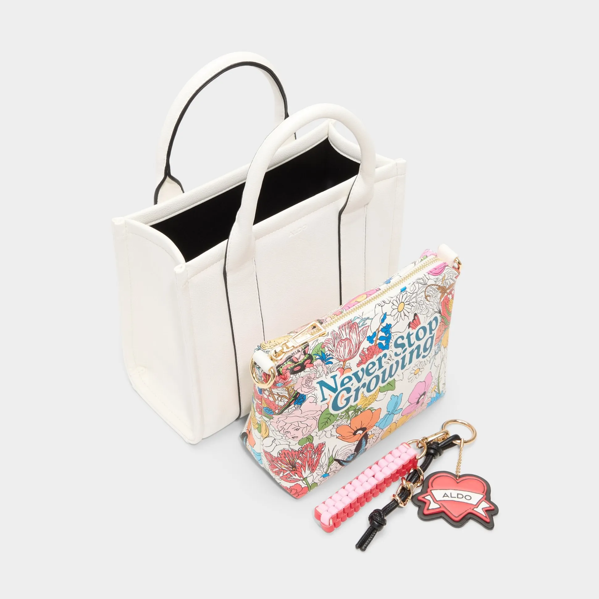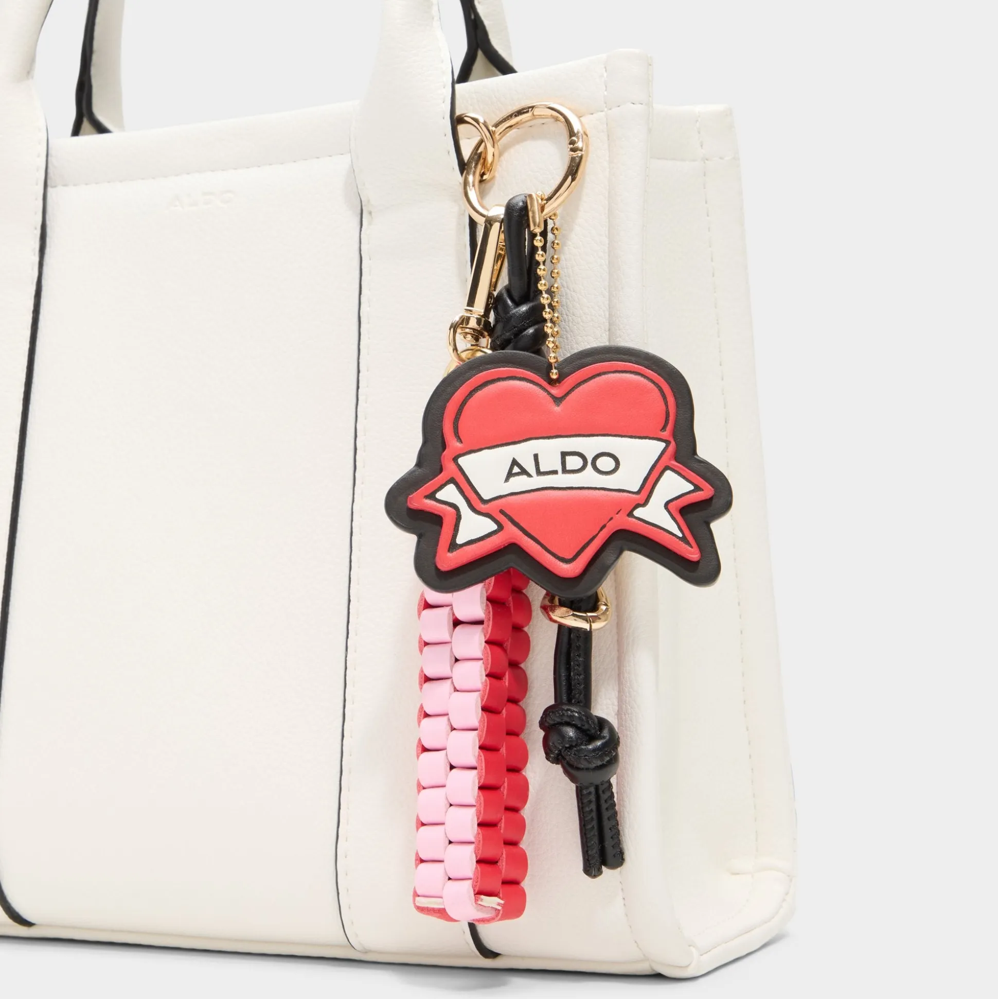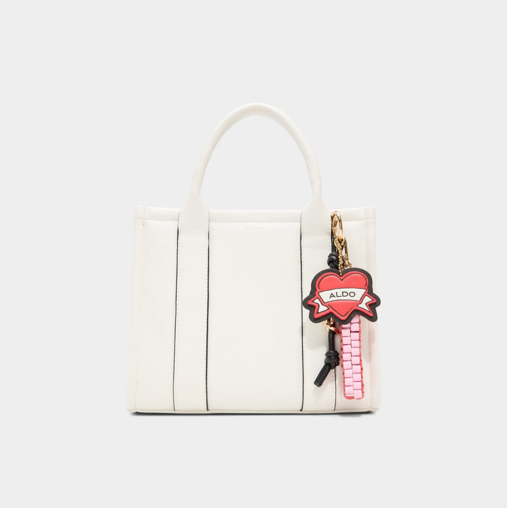 Crisp white panels shape this mini tote into a blank-canvas moment, while a pop-art heart charm swings from the handle as the hero feature that makes errands feel like a street-style moment. Carry it with a blazer for campus runs or tuck it against a sundress at brunch, finishing the look with a playful pop of personality.